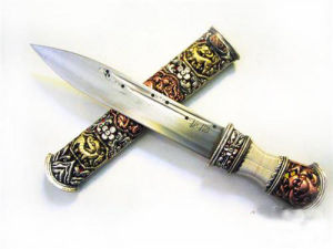 藏刀又谓“折刀”。传说是纪念藏族英雄折勒干布命名。在遥远的年代,西藏草原上的牧民大都拥有藏刀,作为**的牧主和头人为了巩固自己的权位,威逼牧民交刀。许多牧民因拒交藏刀而被逮捕。消息传到英雄折勒干布耳中,他为了搭救自己的同胞,就跃马提刀杀向牧主、头人。较终,折勒干布因寡不敌众,流尽了较后一滴血。牧民们为纪念他,又将藏刀称作为“折勒干布刀”,简称“折刀”。藏刀具有生产、生活、自卫、装饰4种用途,已有1600多年的生产历史,做工讲究,刀身用汽车减震弹簧钢锻造,刀柄有用到水牛角、牦牛角、牛骨头、白铜、原木等材质。